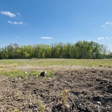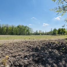 Teren w tylnej części lekko obniżony, porośnięty drzewami – większość drzew widocznych na zdjęciach będzie wycięta przez właściciela terenu.