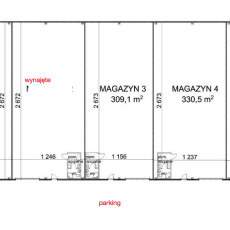 Hala o pow.330,5m2, wymiary 12,3m x 26,7m, wysokość 5,8-7m, posadzka niepylna.