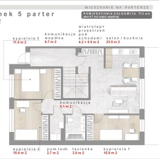 Mieszkanie o pow.77,30m2 składa się z salonu z aneksem kuchennym, trzech sypialni, łazienki, pralni/garderoby oraz schowka pod schodami. Z salonu i jednej sypialni wyjście na taras i do ogrodu.