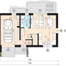 Parter – salon aneksem kuchennym ,łazienka, hall wejściowy z miejscem na garderobę, garaż z wejściem do domu, łazienka.